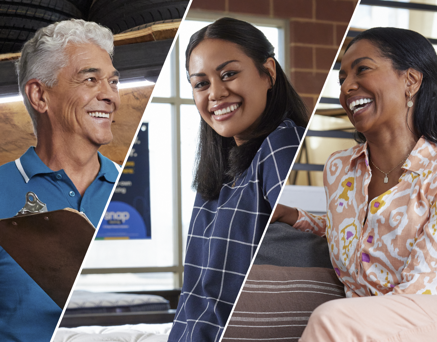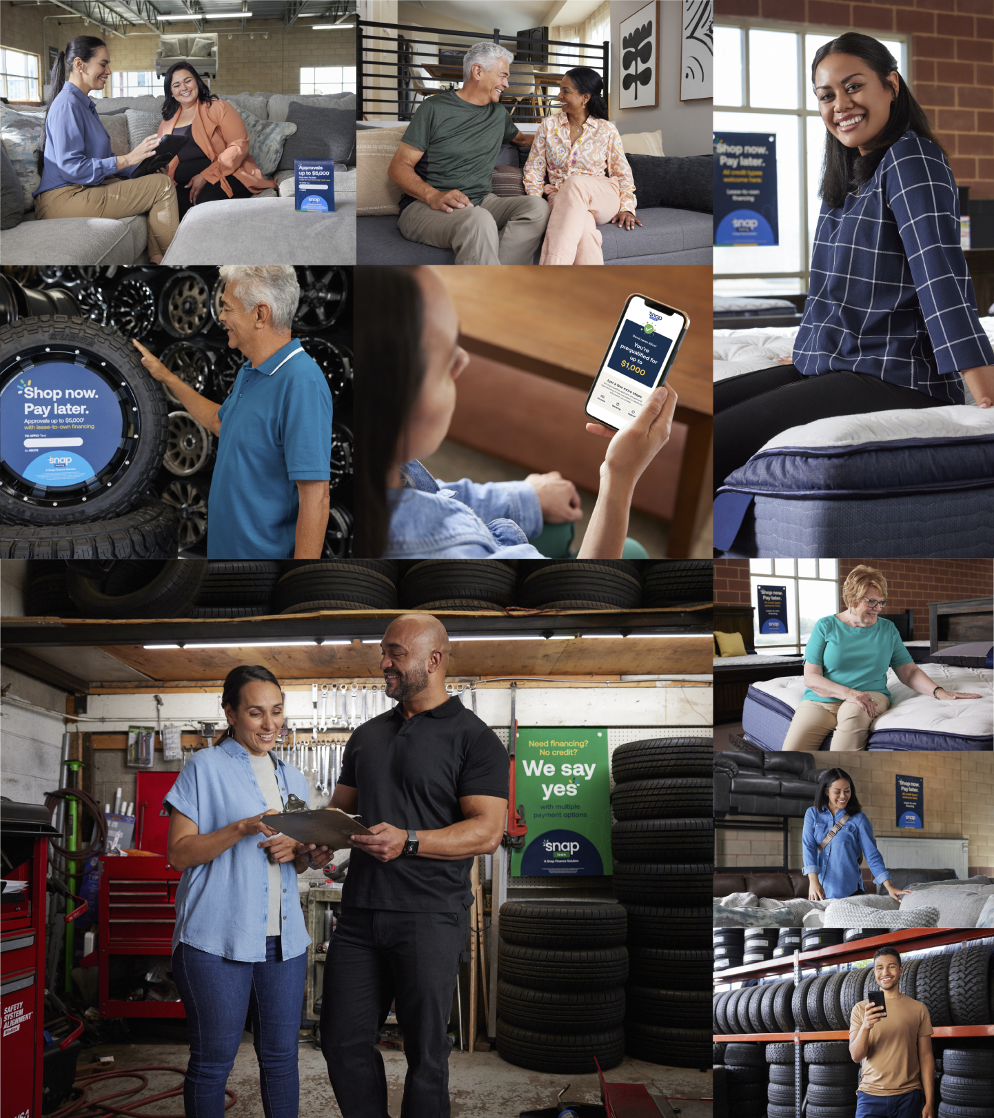Snap Finance offers two main products: Snap Leasing, a lease-to-own financing option, and Snap Loan. Given that point of purchase (POP) advertising is a crucial driver of our business, ensuring that our photoshoot accurately and organically represents each product's POP within the customer journey was a top priority. To achieve this, we focused on our most popular verticals, collaborating closely with our producer to choose talent that mirrors Snap's diverse customer base. We also carefully selected partner locations that offer a genuine depiction of the customer experience, albeit with a slightly aspirational aesthetic to better align with the Snap brand. Our design team provided valuable input on layout preferences, assisting in refining our final selections for their ease of use.